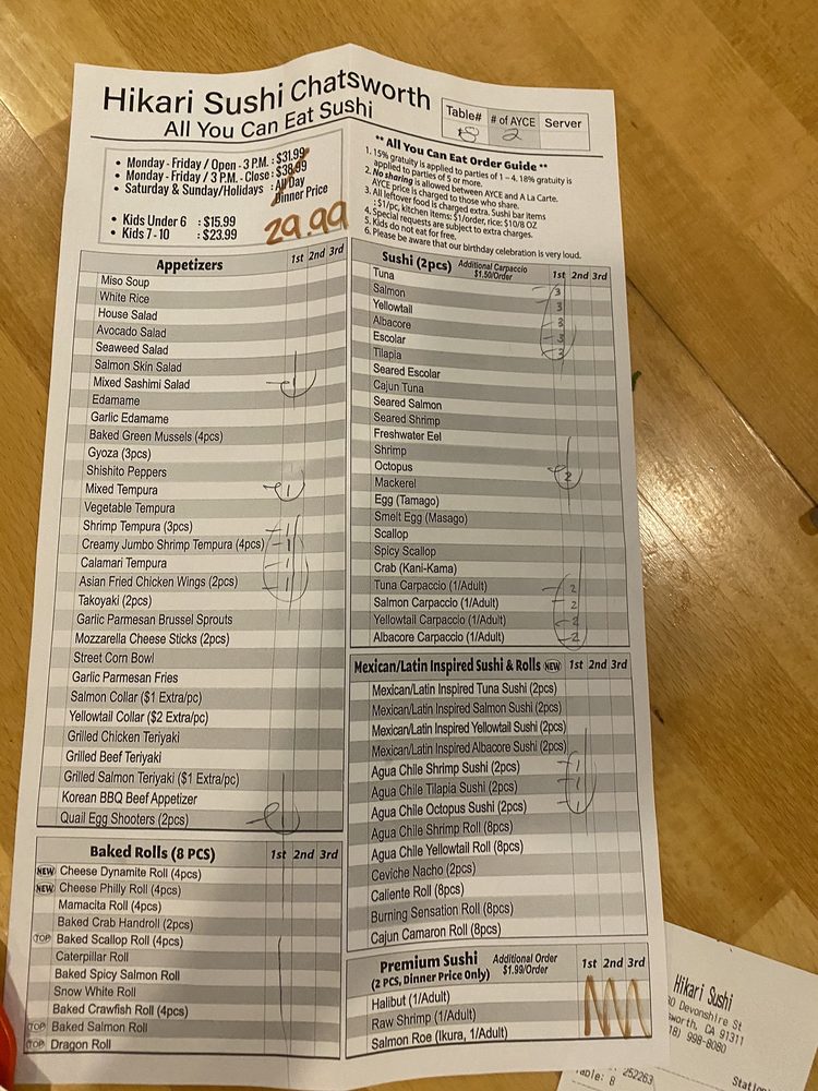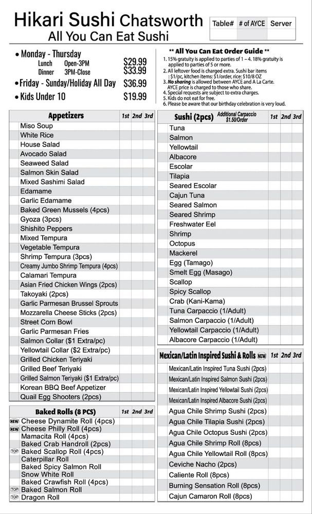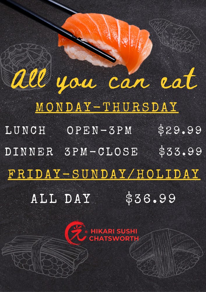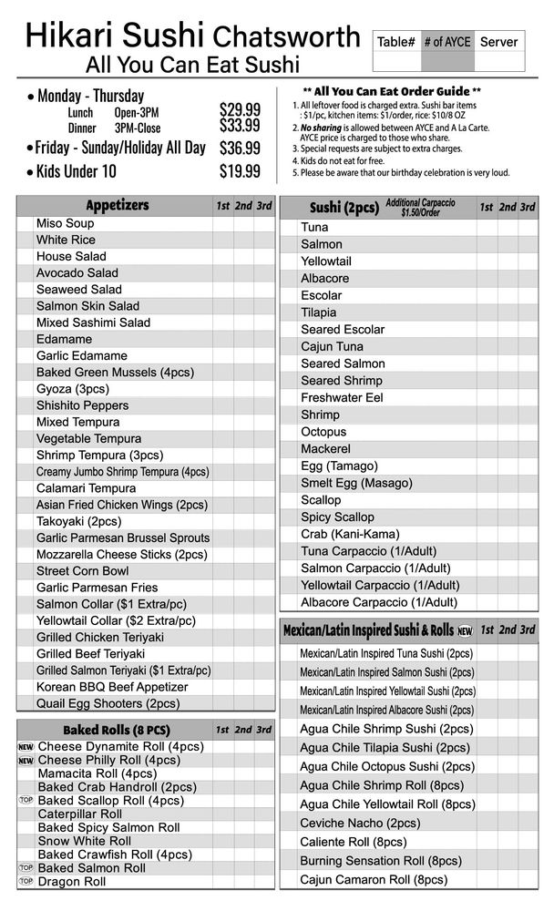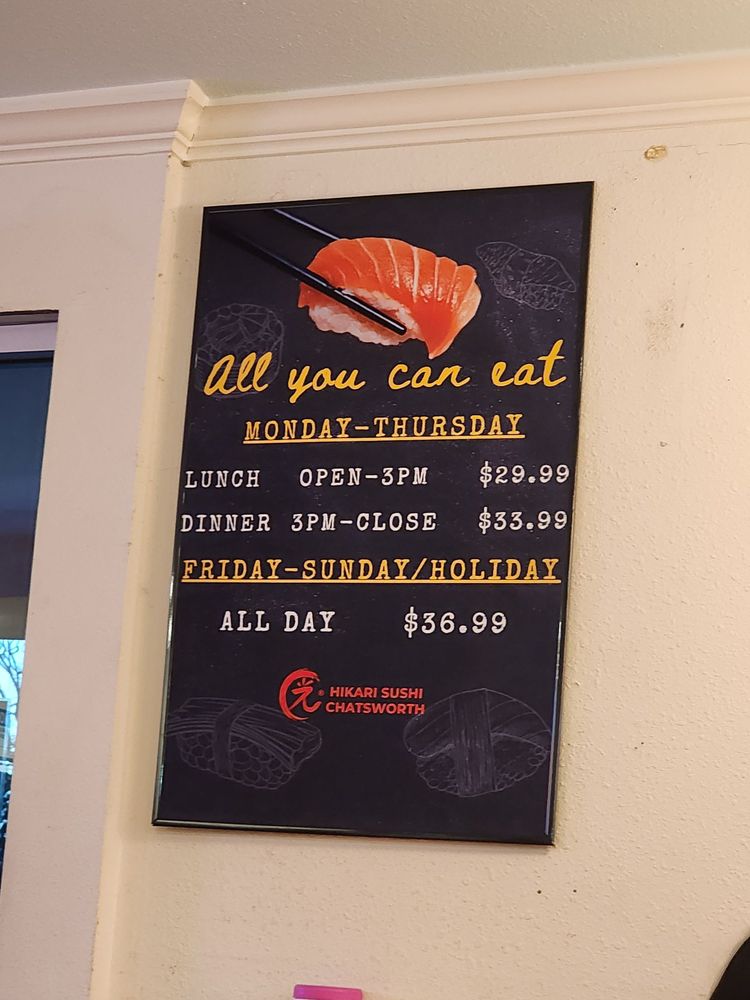 Introducing the menu at Hikari Sushi, a casual Asian-owned restaurant in Chatsworth, CA, offering a wide range of sushi options. From vegan to meat lovers, this spot has something for everyone with its vegan options and limited vegetarian choices. The menu boasts traditional and specialty rolls, as well as nigiri and sashimi selections. Customers rave about the freshness and quality of the dishes, with favorite items including the salmon collar, shrimp tempura, and seared sushis. The all-you-can-eat option is a hit, providing great value for the price. The restaurant's atmosphere is vibrant and welcoming, perfect for both small gatherings and larger parties. With attentive and friendly service, Hikari Sushi is a must-visit for sushi enthusiasts looking for a satisfying dining experience.